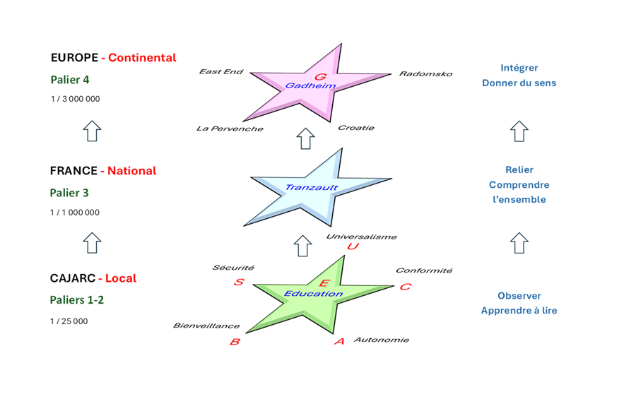 La même étoile – initialement dessinée sur la carte locale par les 24 paysages dépeints dans les tableaux (paliers 1 et 2) – s’est ensuite déployée à l’échelle nationale (palier 3), puis européenne (palier 4) — tout en conservant ses dimensions.