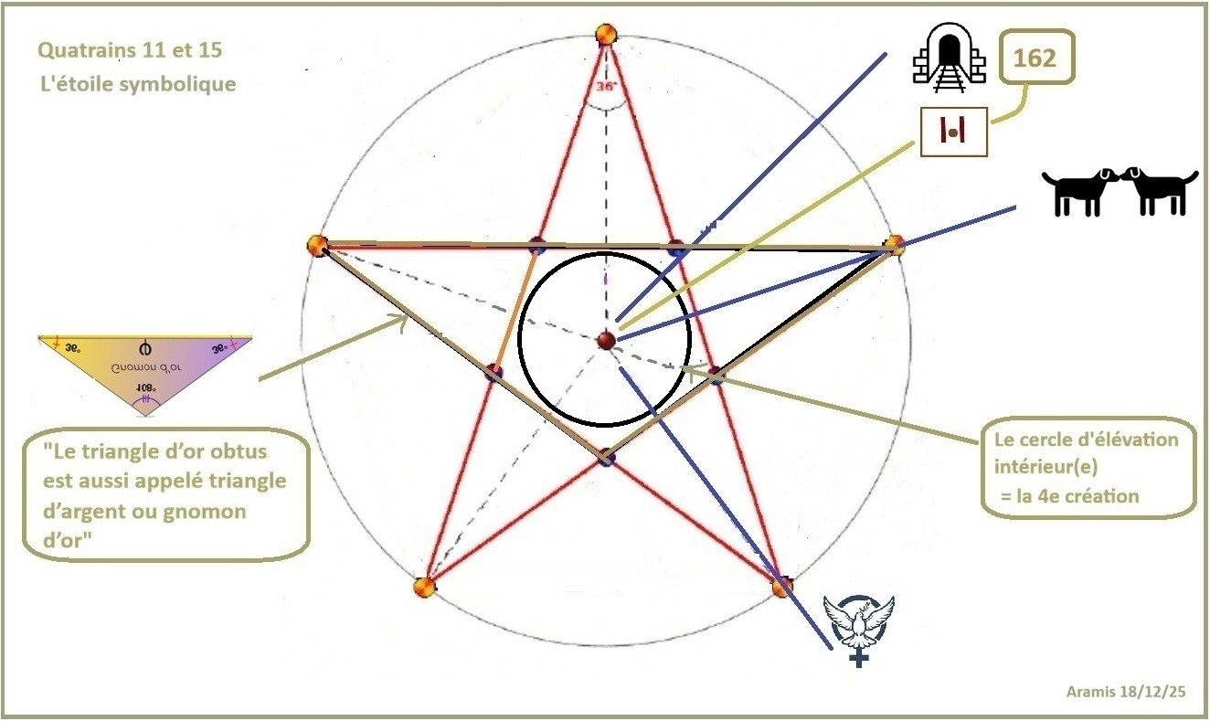 Je crois que l’Arpenteur avait suggéré que le quatrain 11 pourrait être le dernier quatrain et cela est bien possible. « Au final/ au total » pour Q 11 et « enfin détricoté » pour Q15. On dirait que Q11 fait le bilan géométrique et géographique de l’énigme alors que Q15 d’après moi ferait plutôt le bilan symbolique et géographique qui nous mènerait enfin aux dalles. Néanmoins je reste prudente.