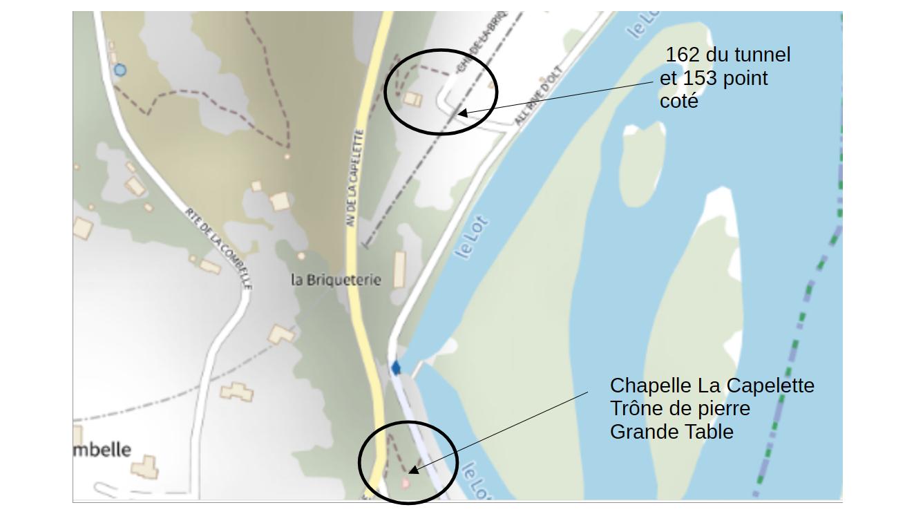 Q 1 : dans un 1er temps on centre le grand cercle sur les Causses de Cajarc : on est bien entré en dépression géologique avec un paysage calcaire. Le centre pourrait être sur les « combes » inscrites en clair près de Cajarc : Combel Fourquet ou La Combelle (combe = dépression). Le mot dépression évoque aussi l’obscurité, alors on change d’option pour se diriger vers la lumière… du nombre d’or (à un près) inscrit sur le tunnel de Cajarc.