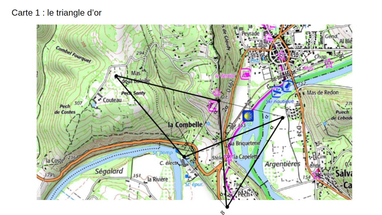 Q 11 : ce nombre d’or nous incite à tracer un triangle d’or dirigé vers Salèmes qu’il irradie de sa lumière (halo dans Hiver 6). Le triangle est bien au cœur de l’étoile. Au cœur du triangle (si on fait la construction en cure-dents – voir Wikipédia + carte 1 ci-dessous) se trouve le tunnel au nombre d’or.