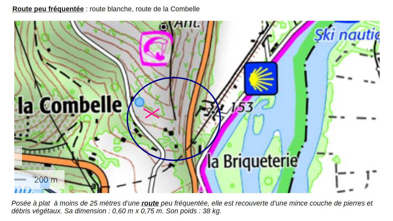 Très jolie carte, l’Arpenteur, et ta précision m’impressionnera toujours ! La dalle est censée être « à moins de 25 m d’une route peu fréquentée », tu parles de quelle route : celle de la Combelle ? Tu sais que j’ai du mal avec les cartes.