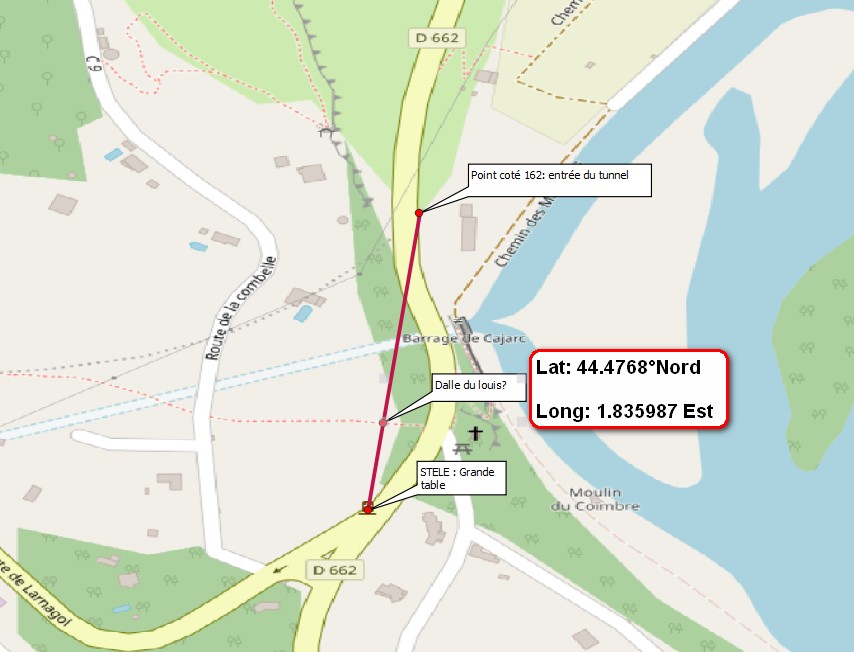 Entre grande table et point coté : je partage la vision d’ Aramis = entre le cercle bleu qui symbolise le réservoir d’eau et le tunnel qui porte symboliquement le nombre d’or (près de la route de la Combelle, que j’imagine peu fréquentée, proposée par le Mousquetaire). J’aime l’idée que le rond soit la grande table ronde des chevaliers du roi Arthur, ceux-là mêmes en quête du Graal. Entre le vase mythique du Saint-Graal et la divine proportion elle aussi devenue mythique, notre trésor à nous, la dalle au louis d’or de granite vert a toute sa place entre les deux.