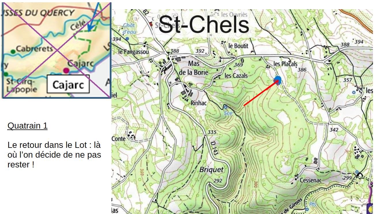 C’est que notre esprit est entré en dépression (autant dire en ébullition) qui tel un cyclone nous précipite plus bas (et/ou alors le lieu est trop triste et on veut redescendre) d’un bond vers le Sud. Il se trouve que le mot « bond » en anglais veut dire « lien » et le lien ici c’est la cote, celle inscrite sur le tunnel de Cajarc, 162 (à un près le nombre d’or) : voilà pourquoi on repart des deux chiens (quatrain 17 centre de l’Éducation) à la recherche du cœur nouveau (nouveau puisque le centre n’est plus le lieu de la table de Q 1 mais un autre lieu, possiblement Ussac en Corrèze de Q 17 selon d’Alice-au-pays-de-Pierre). Déjà dit mais je résume : Q 1 est d’abord envisagé comme le départ du palier 3, mais ira dans la voie sans issue (reste toujours à comprendre pourquoi) et est remplacé par Q 17 qui est bien le 1er quatrain du palier 3 (sa place a été confirmée)