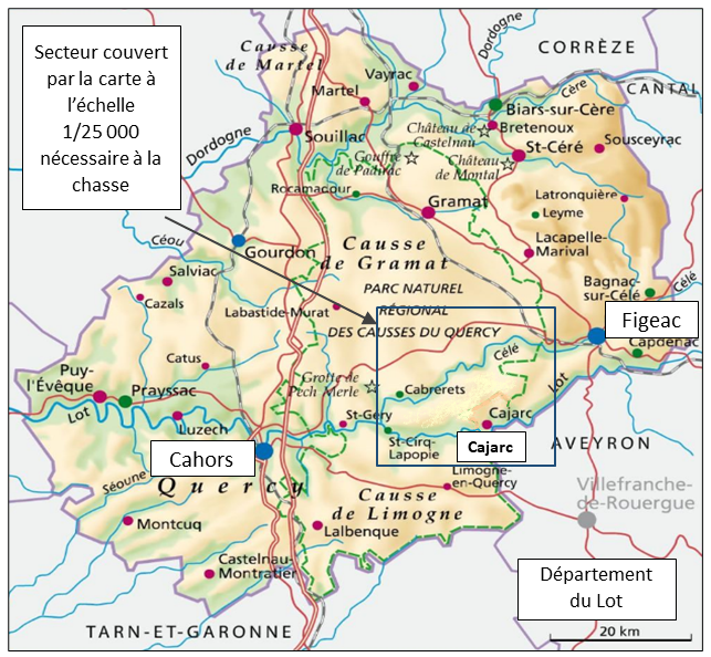 Les deux endroits à localiser sont situés dans la partie Est du Parc Naturel Régional des Causses du Quercy, entre le Lot et le Célé. La zone est encadrée :