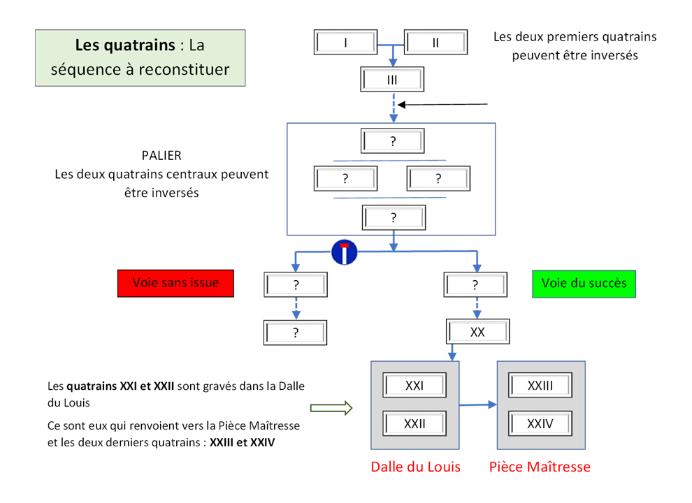 - L’ordre dans lequel les quatrains sont présentés – numérotés de 1 à 20 – a été tiré au sort. Reconstituer leur séquence logique – numérotée de I à XX – est une étape essentielle de la résolution de l’Énigme.