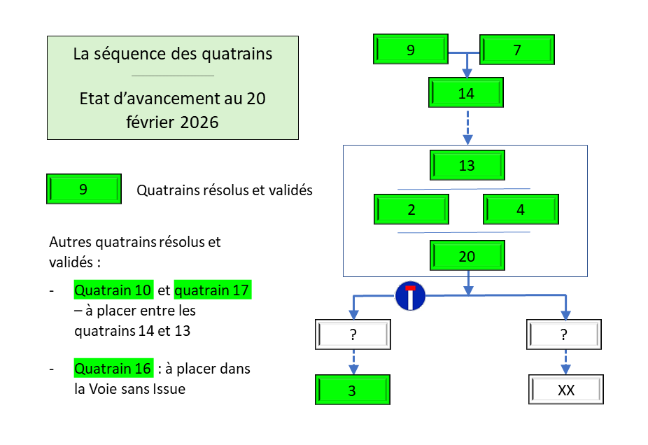 Au 20 juin 2024, seuls trois quatrains (7, 9 et 14) avaient été entièrement élucidés et validés par le Modérateur (voir « Les acquis au 20 juin 2024 »).